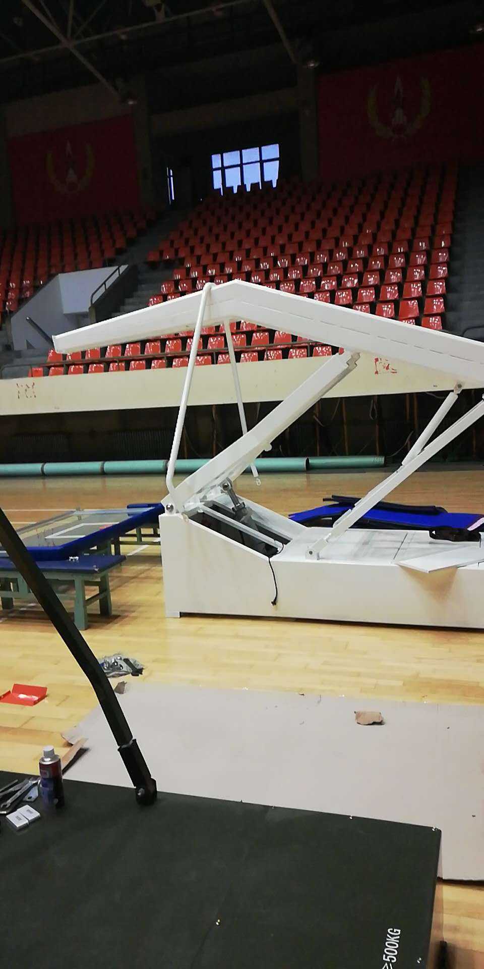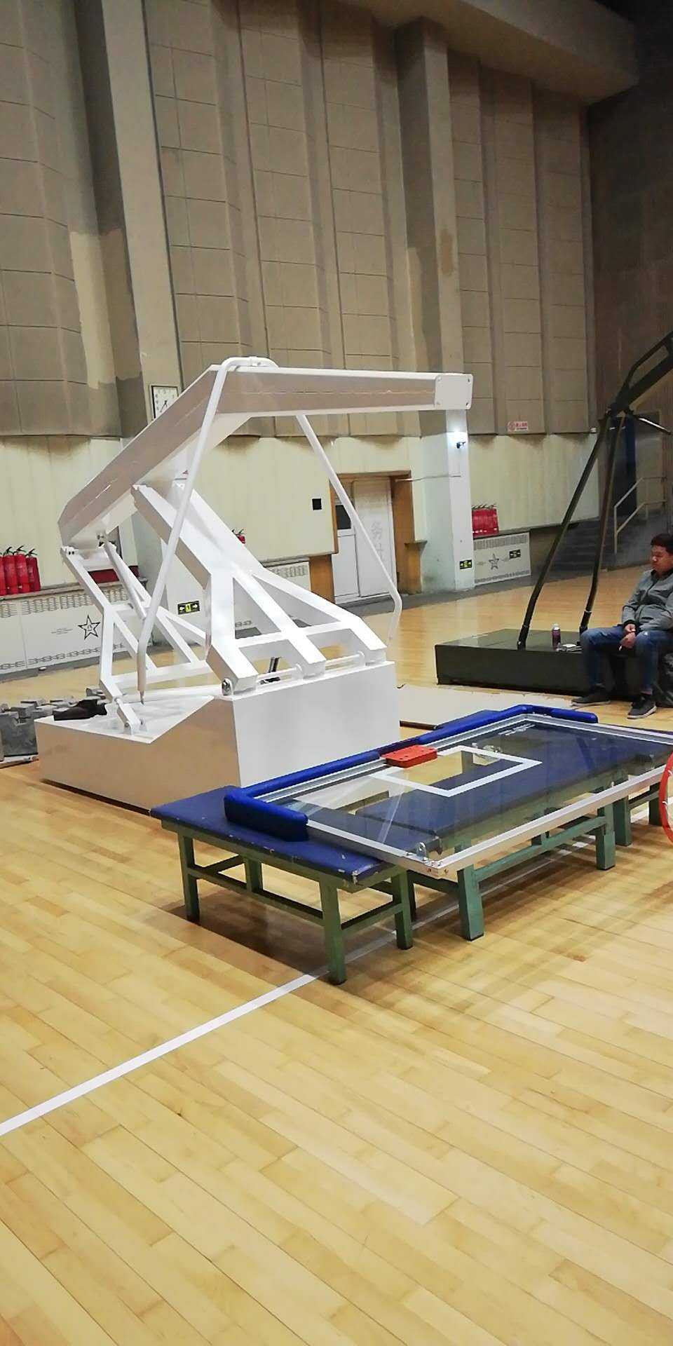 北京海淀區(qū)體育館定制的電動液壓籃球架現(xiàn)場安裝調(diào)試中