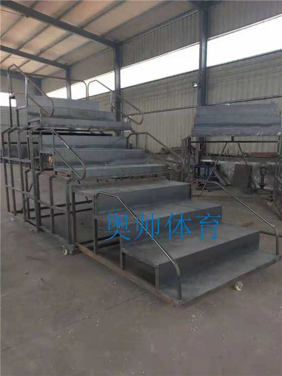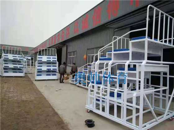 移動(dòng)式伸縮看臺(tái)、帶輪,27座、24座等可訂做,顏色可根據(jù)客戶要求定制【名稱】:可移動(dòng)式終點(diǎn)裁判臺(tái)【顏色】:(可根據(jù)客戶要求定制)27座伸縮裁判臺(tái)尺寸規(guī)格:5100*1900*2700mm收縮后尺寸 2300*1900*2700mm【材質(zhì)】:1:底盤使用規(guī)格為4×6cm、厚度為2.5mm的優(yōu)質(zhì)方管。2:階梯使用規(guī)格為4×4cm、厚度為3.0mm的優(yōu)質(zhì)角鐵。3:扶手使用直徑為32mm、厚度為3.0mm的優(yōu)質(zhì)圓管。4:臺(tái)階面使用厚度為3.0mm的優(yōu)質(zhì)防滑花紋板。5:座凳使用優(yōu)質(zhì)硬質(zhì)橡塑凳面,表面平整光滑、底下有螺絲將他和架子固定在一起。6:移動(dòng)萬向輪,使用方便、安全,操作簡(jiǎn)單?!竟に嚒浚?、焊接:均使用二氧化碳?xì)怏w保護(hù)焊機(jī)焊接,無焊渣、無砂眼,焊接牢固。2、表面:本產(chǎn)品使用靜電噴涂、美觀耐用。